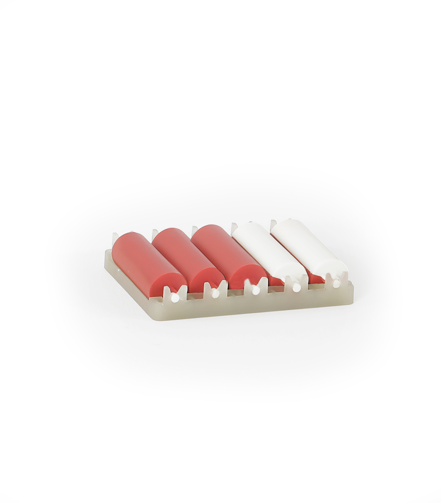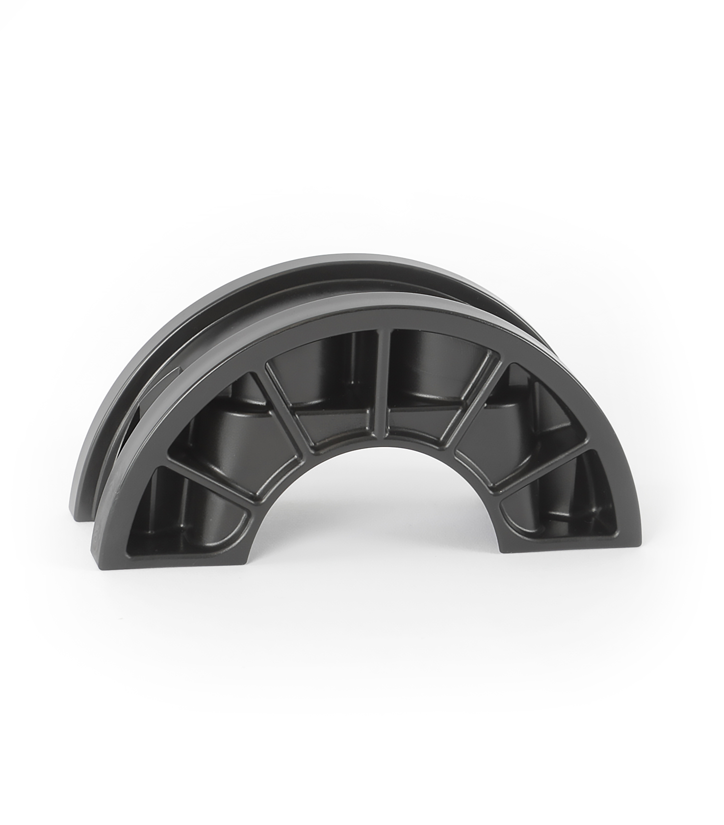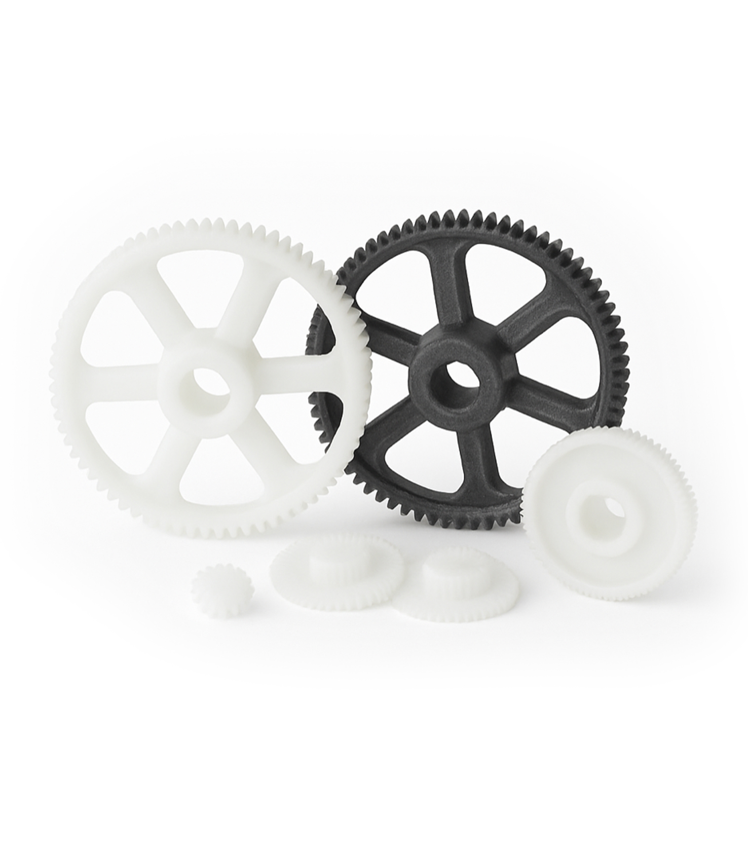 Das Bild zeigt im vorderen Bereich ein Kunststoffteil mit 3 Gewinden. Das Teil dient als Leitmutter der im Hintergrund dargestellten Verstelleinheit. Ein Gewinde M5x0,5 dient als Leitgewinde für die Spindel sowie 2 x M3 Gewinde zur Bauteilbefestigung. Aufgrund der geringen Stückzahlen wurde kein Ausdrehwerkzeug realisiert. Das M5x0,5 Gewinde wird durch Wechselkerne hergestellt, die umspritzt und anschließend manuell entformt bzw. ausgedreht werden. Die zwei M3 Gewinde werden manuell ins Bauteil eingebracht. Bei größeren Stückzahlen können wir derartige Artikel auch mit Ausdrehwerkzeugen realisieren.